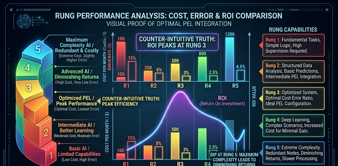 The data reveals what no vendor slide will: Rung 3 outperforms Rung 5 on ROI despite costing more in tokens. The 7.2% error rate at full autonomy generates downstream correction costs reprocessing, regulatory callbacks, remediation that dwarf the token savings.