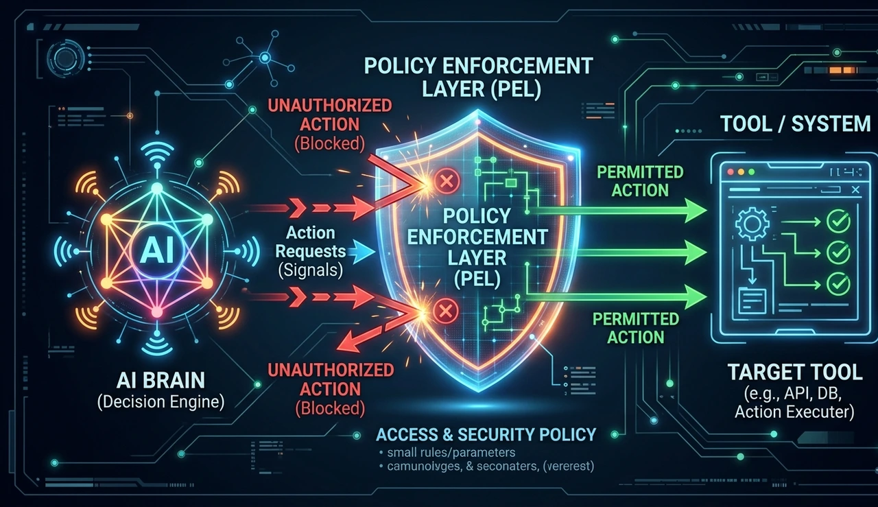 The solution is a Policy Enforcement Layer (PEL) , a deterministic rule engine sitting between the agent's planned actions and actual tool execution. The agent proposes. The PEL validates. Invalid actions are rejected before execution; the agent must reason around the constraint. This is what separates a POC from a system you can defend to your board, regulators, and legal team.