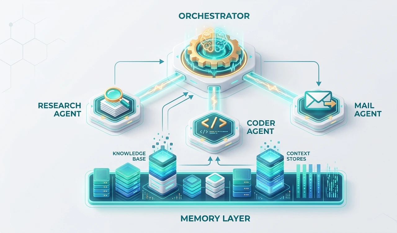Layer 2: Specialized sub-agents Each sub-agent should own exactly one job. 'Swiss Army' agents that browse, code, email, and query databases are a common early-stage mistake. When one component does everything, failures become unpredictable and debugging becomes guesswork.